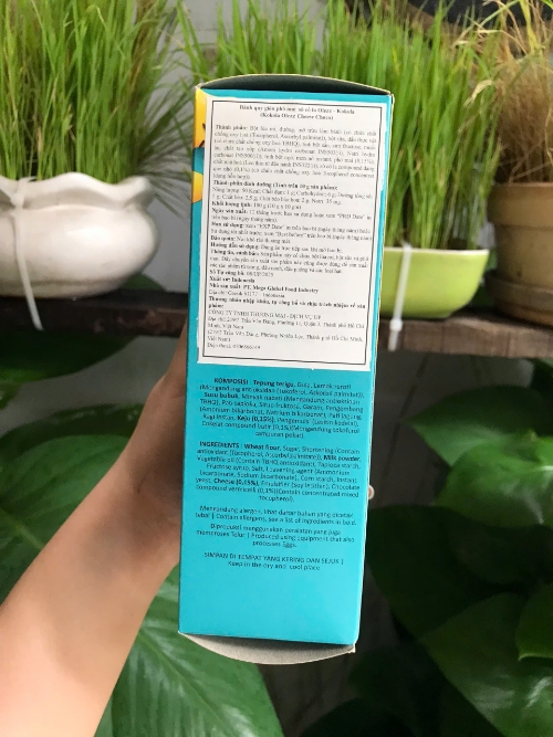 oxy hoá (Tocopherol, Ascorbyl palmitat)), bột sữa, dầu thực vật (có chứa chất chống oxy hoá TBHQ), tỉnh bột sắn, siro fructose, muối ăn, chất tạo xốp (Amoni hydro carbonat INS503(ii), Natri hydro carbonat INS500(ii)), tinh bột ngô, men nở instant, sô cô la compound. (0,15%), sô cô la compound dạng que nhỏ (0,1%) (có chứa chất chống oxy hoá Tocopherol concentrat (dạng hỗn hợp), chất tạo màu tự nhiên (Titan dioxyd INS171), chất tạo màu tổng hợp (Sunset yellow FCF INS110, Brilliant blue FCF INS133, Tartrazin INS102, Ponceau 4R INS124)), chất nhũ hoá (Lecithin tử đậu nành INS322(i))
